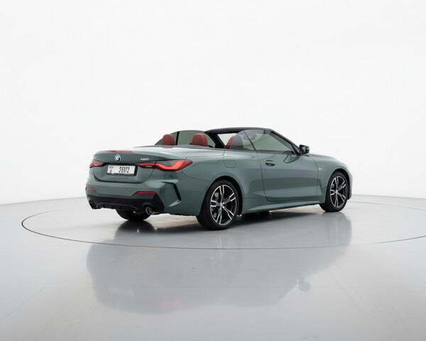 BMW 420i 2025, Convertible. This vehicle features a powerful 2.0T engine complemented by a luxurious leather interior. The presence of a navigation system, Bluetooth, Car Play, Isofix, and electric door drives makes every trip comfortable and safe. A rearview camera simplifies maneuvering. The cost of using the vehicle is 10,499 AED for six months.